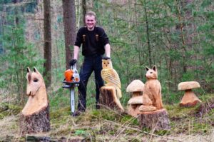 Vandaag aanwezig boomkunstenaar Mervin Goossen. Mervin laat jullie live zien hoe hij uit een grote houten boomstam mooie jonge dasjes zaagt. Een behoorlijke maar ontzettend leuke klus waar Mervin tussen 11:00 uur en 16:00 uur aan zal werken. Stukje bij beetje zullen vandaag de jonge dasjes zichtbaar worden. Wil jij ook zien hoe een Mervin met zijn motorzagen een grote boomstam omtovert tot een waar kunstwerk? Kom dan naar het Bos van Daantje Das! Leuk voor jong én oud. De demonstratie is gratis voor bezoekers van het Bos van Daantje Das. Aanmelden is niet nodig. En natuurlijk kan je in het Bos van Daantje Das ook lekker spelen of een leuke speurtocht maken!