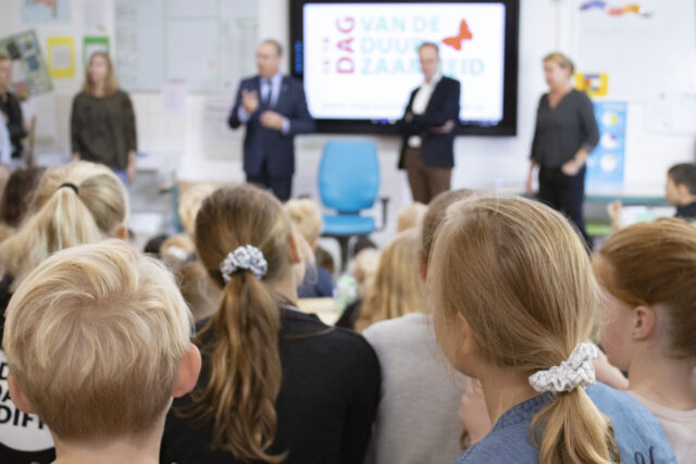 Bestuurders lezen voor aan leerlingen van De Werkschuit over duurzaamheid