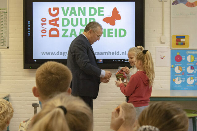 Het blijft op deze bijzondere dag in de klassen niet alleen bij voorlezen. Voorlezers in het hele land gaan met de kinderen in gesprek over het thema duurzaamheid. Voor de leerlingen van groep 4 en 6 van de Werkschuit is duurzaamheid overduidelijk geen nieuw begrip: wanneer wethouder Dogger ze ernaar vraagt schieten de vingers omhoog. Ze weten al van alles over afval scheiden, hoe belangrijk bomen zijn voor de gezondheid en de ernst van de plasticsoep. Het aanbod van Matthijs Nijboer om met de klassen een hele dag workshops te doen over duurzaamheid, viel bij deze bewuste leerlingen dan ook goed in de smaak! Ook de directrice van de Biologie Plus school, Mirjam van der Meijden, reageerde dolenthousiast op het cadeau: “Dit past perfect bij onze school!”.