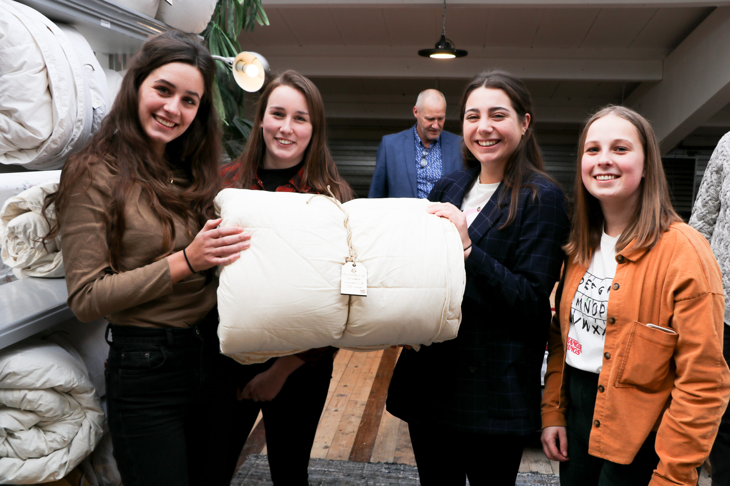 Het dekbeddenproject is één van de succesvolle projecten van Circulair Ambachtsnetwerk WaardeRing, waarin veel partners met elkaar samenwerken. Studenten van partner Cibap ontwierpen een verkoopconcept, posters, flyers en het label. ‘In eerste instantie wisten we niet goed wat we met deze opdracht aan moesten’, vertelt student ruimtelijke vormgeving Manon Liefers. ‘Kringloop, oude dekbedden, we vonden het lastig. Maar ons enthousiasme groeide steeds meer. Vooral toen ons verkoopconcept werkte. We hadden een mooie winkelpresentatie bedacht, maar toen we een paar dagen later kwamen kijken, was het al helemaal veranderd omdat er al heel veel verkocht was! Kijk, op school hebben we wel het vak Visual Merchandising, maar als je dan in de praktijk op deze manier merkt dat het echt werkt wat je leert, is dat toch wel heel erg leuk!’ De studenten hebben veel opgestoken van het project. ‘Je hoeft niet altijd nieuwe dingen te gebruiken, je kunt producten ook op een heel circulaire en duurzame manier presenteren met gerecyclede elementen. Ik heb een andere kijk op kringloop gekregen. Je moet door de spullen heen kijken, dan krijg je er heel veel voor terug: je hebt voor een goede prijs een mooi product waarbij de CO2-uitstoot wordt verminderd. Dat is toch geweldig?’