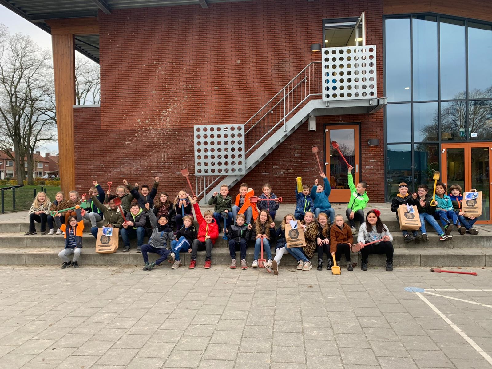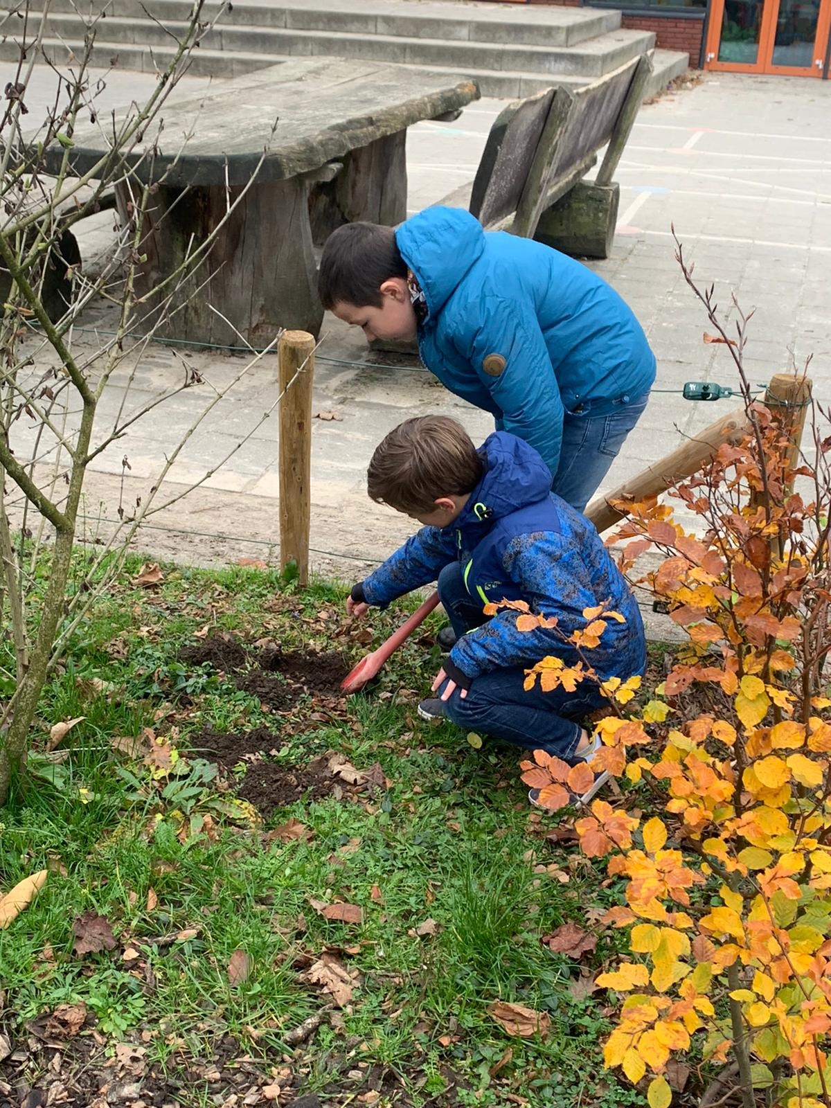 Gewapend met een schep en een handvol bloemenbollen komen de leerlingen in actie. Groep 5 plant de helft van de bollen op het plein, en groep 6 is verantwoordelijk voor het openbaar groen rondom de school. Met een rode blos op de wangen zijn de leerlingen druk aan de slag. Als een geoliede machine werken ze samen: de één schept, de ander legt de bol in de zorgvuldig gegraven geul en een laatste stampt de aarde weer voorzichtig aan. En ze weten heel goed waarom het zo belangrijk is dat ze dit doen. “Bloemen zijn belangrijk voor de natuur en daar vliegen de bijen naartoe”, zegt Karlijn uit groep 5.