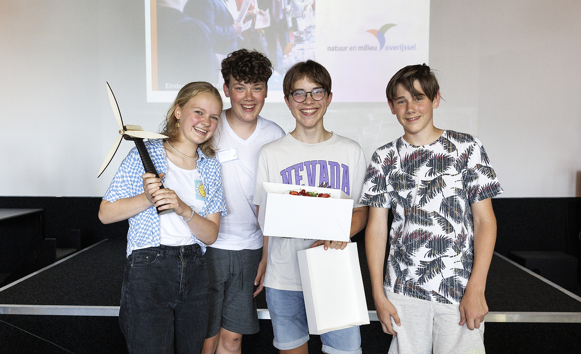 Hoe kun je Overijssel energieneutraal maken? Hoe laat je inwoners beter energie besparen? Leerlingen deden onderzoek, vormden een eigen visie en mening en gaven antwoord op deze vragen in het project Adviseurs van de Toekomst. Stuk voor stuk leverde dit originele, inspirerende adviezen op. Het leerlingenadviesbureau ‘Buiten Groen’ van Zone College Enschede sleepte de winst in de wacht. Hidde van Ooststroom van Nieuwe Energie Overijssel mocht als voorzitter van de jury de prijs aan de leerlingen overhandigen.