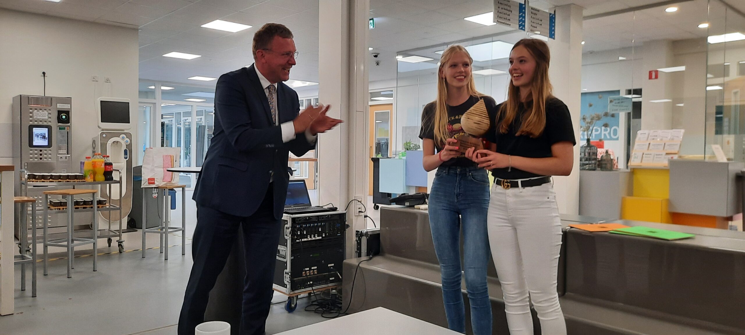 Vandaag overhandigde A3Bureau officieel hun advies aan hun opdrachtgever Jan Smits, voorzitter van Vereniging de Ommerschans. Ook Smits was onder de indruk van hun video: “In het filmpje springt het directieteam zo de film in; dat ze zo als spring-in-‘t-veld functioneren is een uitstekend promotiemiddel voor onze vereniging!”. Wethouder Bart Jaspers Faijer was ook bij de overhandiging aanwezig en had de eer om de bokaal voor Het Beste Adviesbureau van Adviseurs van de Toekomst 2021 aan de leerlingen te overhandigen.