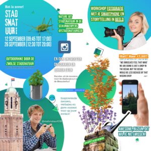 De Nature Bit bestaat uit een tweedaags programma met verschillende workshops. Op zondag 12 september ga je op pad met Agnes van het instagramaccount @poppetjeonthemove om de ins en outs te leren van smartphone-fotografie en storytelling. Agnes gaat graag de natuur in en deelt op haar insta de woelige avonturen van haar houten dummy-poppetje. Na deze workshop maken jullie met Bernadet van ErUit een wandeling door Zwolle om eens met andere ogen te kijken naar de natuur in de stad.