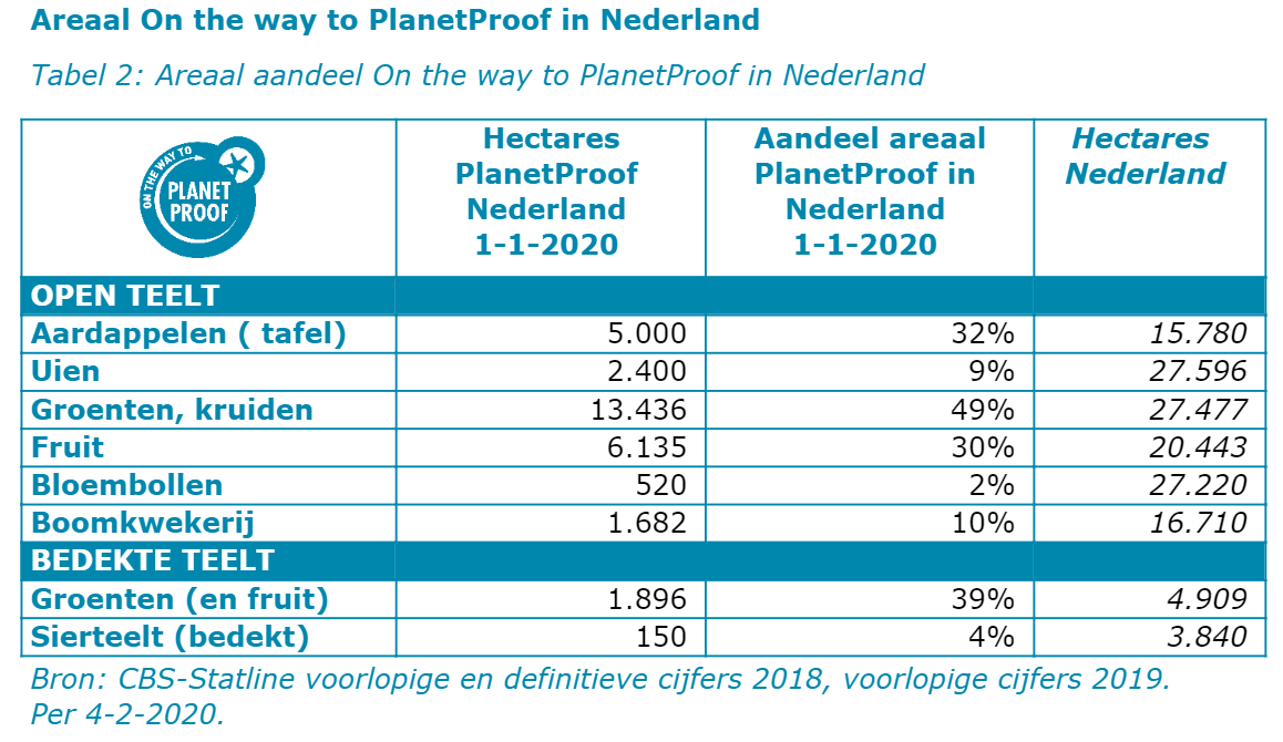 Per januari 2020 zijn er bijna 1.300 Nederlandse telers die hun plantaardige productie verduurzamen op basis van de criteria van On the way to PlanetProof. Dit zijn de bedrijven die een grote bijdrage leveren aan de verbetering van onze leefomgeving. In Nederland gaat het om de teelt van aardappelen, groenten, fruit en sierteeltproducten, met in totaal ruim 31.000 hectare. Buiten Nederland zijn er 145 gecertificeerde telers, waarvan het merendeel in Spanje, met in totaal bijna 3.200 hectare. Zij zorgen met name in het winterseizoen voor de aanvoer van On the way to PlanetProof geteelde groenten. Ook zijn er nog ruim 70 handelsbedrijven in Nederland en buitenland gecertificeerd.