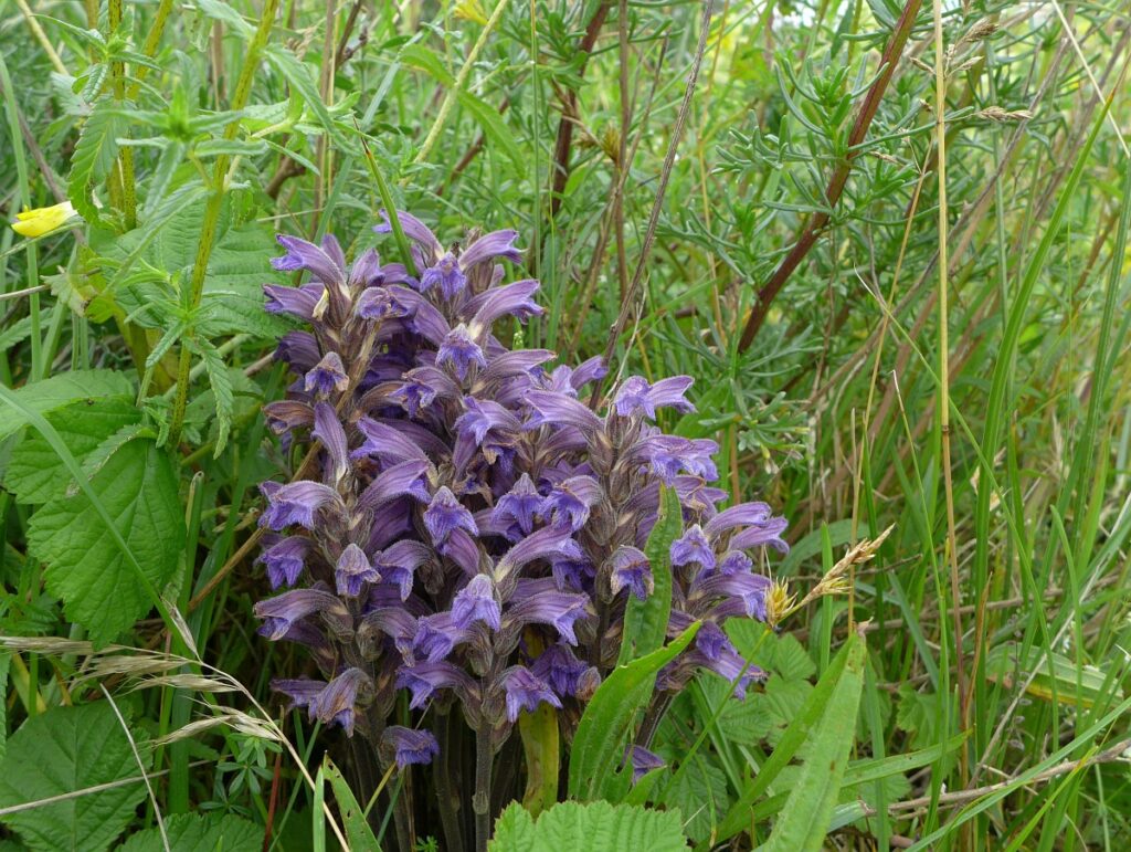 Ons projectteam is vooral geïnteresseerd in het stroomdalgrasland, omdat wij daarvoor in de andere Natura 2000-gebieden ook een opgave hebben, zoals in Fortmond, Olsterwaarden en bij het Zalkerbos. Dit is een soort landschap dat heel uniek is. Melvin wijst ons op de groei van de ruige weegbree en de blauwe bremraap (zie foto’s), typerend voor dit bijzondere landschap. En de groep wordt extra enthousiast als blijkt dat ook de liggende ereprijs hier groeit: een uitzonderlijke bloem.