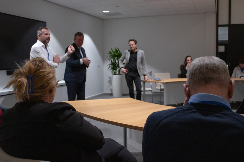 De middag begint gezamenlijk in de grote hal van Cogas waar André van der Zee in gesprek gaat met directeur Natuur en Milieu Overijssel Andrea Kuiper, gedeputeerde Tijs de Bree, en Cogas directeur transitie Richard Lohuis. Andrea over het festival: “Het blijft belangrijk om kennis te delen en zo de energietransitie te versnellen. Ik hoop dat de mensen straks weer met goede zin naar huis gaan om een stap verder te zetten.” André vraagt Tijs naar het huidige en toekomstige beleid binnen de politiek. Tijs wil geruststellen: “Als beleid wordt veranderd, moet je daar iets mee. Maar projecten in een vergevorderd stadium gaan we niet stil leggen.”