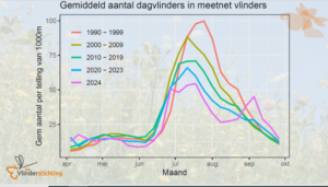 2024 was (landelijk) een slecht vlinderjaar, helaas zien we deze dalende trend al meerdere jaren achter elkaar. De vrijwilligers hebben veel kennis over de gebieden. Zo konden zij de omstandigheden koppelen aan de resultaten per jaar. We constateerden dat het wegvallen van maatregelen op de vlinderroutes duidelijk zichtbaar was in de telresultaten.