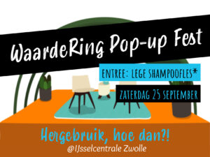 Op zaterdag 25 september van 12.00 tot 16.00 vindt in de oude IJsselcentrale in Zwolle het WaardeRing Pop-Up Fest plaats. Een inspirerend evenement over mensen en materialen, waarde en herwaardering, hergebruik en recycling. Verschillende bedrijven uit de regio demonstreren hun innovatieve circulaire producten en diensten. Op het Pop-Up Fest kun je ook luisteren naar “Trash Talks” over duurzaamheid en gedragsverandering of unieke Vintage voorwerpen scoren van de Schatkamer. De entreeprijs voor dit alles? Een lege shampoofles om ter plekke te recyclen.