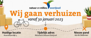 Natuur en Milieu Overijssel schrijft dit jaar een nieuw hoofdstuk in haar bijna 50-jarige geschiedenis. We gaan per 1 september 2023 namelijk verhuizen naar een mooi nieuw pand: het Huis van de leefomgeving. Voordat het zover is, zitten we op een tijdelijke locatie.